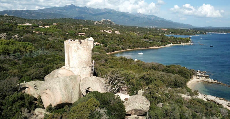 Elle trône sur un site remarquable : un chaos rocheux cerné de plages de sable blond bordées de tamaris, joncs et lentisques.