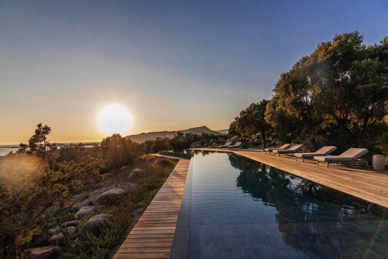 En contre-bas, la terrasse donne accès à une piscine miroir, à débordement de 27x5M. La terrasse piscine face à la mer est équipée de 8 transats, matelas et coussins.